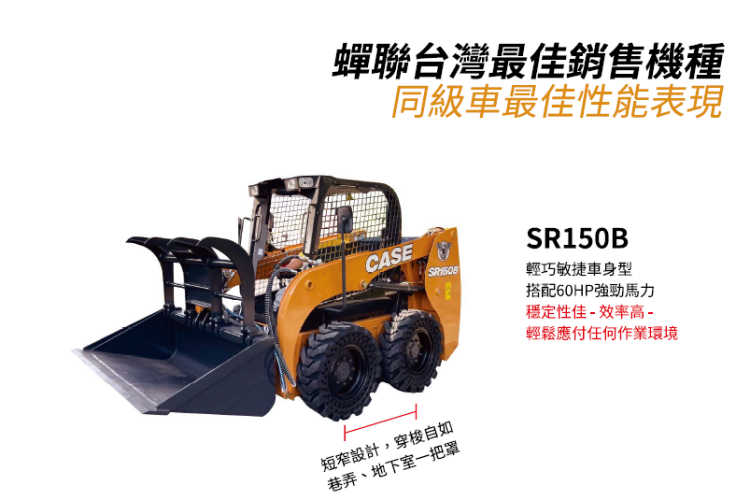CASE SR-150B 鏟裝機,在台灣俗稱山貓/小山貓,可原地360度迴轉,狹小空間作業也可穿梭自如,結構堅固,操控簡單,多種配件可搭配,不論是園林綠化、路面修補、農業使用...等,用途廣泛,絕對是您工作上的好幫手。