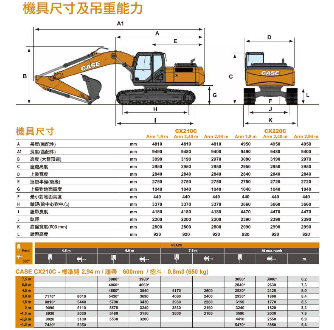 | 履帶長度 | 3500 mm | 4180 mm | 4850 mm | 4980 mm | 5450 mm | 5880 mm |